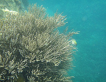 This one was taken at Banana Island - located near Malcapuya Island and is surrounded by coral reefs making it an ideal snorkeling destination. This part is deep enough for humans not to step foot on the corals but by floating above it one can clearly see everything and it makes even better if you bring in some bread to attract the fishes to gather around you like rockers attending a music festival they'll form a crowded circle and swim over the other like bodies flying on a mosh pit - but this time they're just after the bread feeding frenzy.