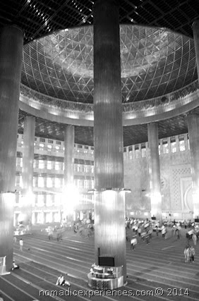 If the sheer size of the Istiqlal Mosque is impressive on the outside, the interior brings forth a world-within-a-world feeling. The towering twelve stainless columns that adorns the grand praying hall easily dwarfs dozens of faithfuls seen deeply engrossed in their prayers from afar. Our jovial tour guide told us that "this is the biggest Mosque in Asia", though I told myself to consult Wikipedia first before believing him, I can't deny that hugeness of the Mosque, provides a palatial atmosphere.